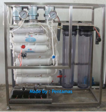 Reverse Osmosis System adalah sistem pengolahan air dengan tekanan tinggi untuk memaksa air melalui membrane Reverse Osmosis. Agar mendapatkan hasil optimal maka PENTAMAS menawarkan pengolahan air Reverse Osmosis System yang populer dikenal sebagai sistem RO. Adapun sistem RO ini menggunakan metode 5 (lima) tahap sehingga penyaringan air lebih sempurna terhadap berbagai pencemaran di dalam air, yaitu: